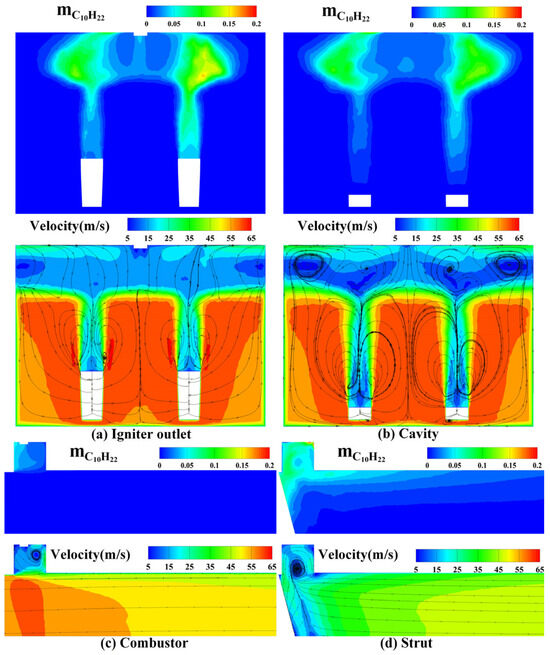 As shown in Figure 5, in the spreading direction, Figure 5a and Figure 5b are respectively, mass fraction of C10H22 and velocity streamline distribution diagrams of the outlet section of the igniter (slice 1) and the symmetrical section of the cavity (slice 2). In the axial direction, Figure 5c and Figure 5d show the fuel distribution and velocity streamline distribution of the symmetrical section of the afterburner (slice 3) and the symmetrical section of the strut (slice 4), respectively. By observing the velocity streamline distributions in Figure 5a,b, it can be seen that, in the direction of spreading, under the joint action of cavity and strut, a more complex vortex structure and recirculation zone are formed inside the cavity, which are generally two large recirculation zones and a number of small low-speed recirculation zones. The vortex structure of the exit section of the igniter and the symmetrical section of the cavity are different, but the distribution of the low-speed recirculation zone is generally similar. This is because the symmetrical section of the cavity is more backward than the section of the igniter, so the entrapment of the cavity is more intense, and the vortex structure is larger and more complex. The velocity in the recirculation zone is much lower than the inlet velocity of the combustion chamber and is basically symmetrical. It can be seen from the fuel distribution map that the distribution trend of fuel is basically the same as that of the recirculation zone. Obviously, after the igniter ignites the fuel, the flame can develop to the fuel-rich area and spread to both sides and the lower side in the exhibition.