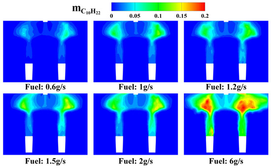 Mass fraction of C10H22 in the symmetric cross-section of the igniter under different fuel flow rates.