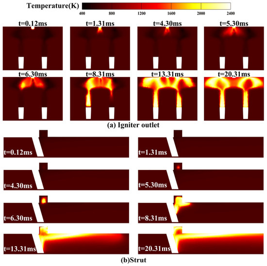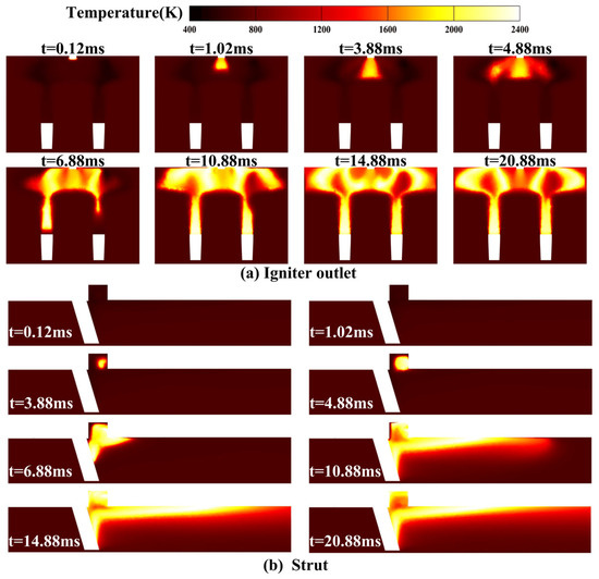 At t = 0.12 ms, the ignition kernel forms at the igniter exit. At t = 1.02 ms, the ignition kernel exhibited significant thermal dissipation due to strong velocity gradients, with the core temperature declining to approximately 2000 K while demonstrating distinct outward jetting characteristics. At t = 3.88 ms, the temperature at the ignition kernel had further decreased to almost 1700 K as it reached maximum spatial expansion, indicating that the initial ignition kernel just vanished, accompanied by rapid heating in adjacent fuel-rich zones and emerging flame at the strut symmetry plane. Subsequent evolution at t = 4.88 ms revealed stabilized flame in the cavity with bilateral ignition of fuel-rich zones, forming new flame that progressively expanded into the cavity. By t = 6.88 ms, bidirectional flame propagation became evident along both cavity sidewalls and the strut wake region, with gradually intensifying combustion temperatures. The system reached complete fuel-rich zone ignition at t = 10.88 ms, sustaining active flame propagation toward downstream combustion areas. Full fuel consumption was achieved at t = 14.88 ms, establishing stable flame anchoring that matured into organized combustion by t = 20.88 ms, demonstrating successful flame stabilization throughout the combustion chamber.
