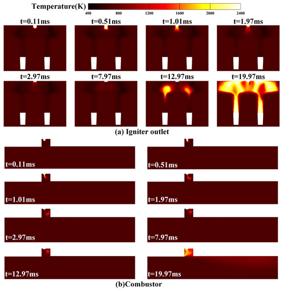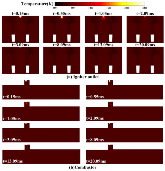 To investigate flame development and propagation during spark plug ignition, Figure 8 presents flame propagation diagrams under the condition of mf = 2 g/s. Figure 8a and Figure 8b illustrate the dynamic ignition process in the afterburner, captured at the symmetric cross-section of the igniter outlet (slice 1) and the strut (slice 4), respectively.