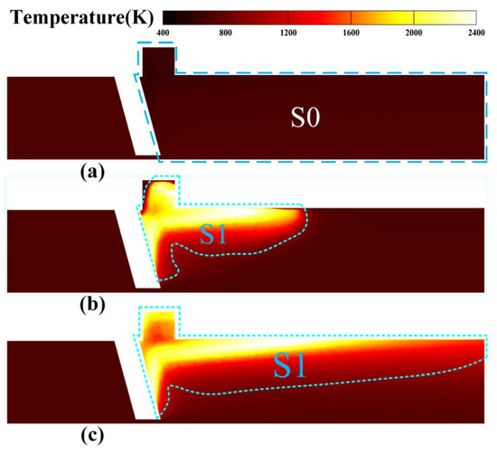 To precisely measure the flame stabilization time, zone S0 downstream of the combustor strut (slice 4) was designated within the combustion chamber as illustrated in Figure 11a. Through image recognition, the area where temperature exceeds 1200 K at time instant tn was identified as S1tn (ignited) as illustrated in Figure 11b,c, where Figure 11b is the flame area at time tb, and Figure 11c is the maximum flame area formed under that operating condition. When tb = 0, ti = tc − tb.