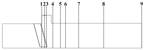 To facilitate systematic analysis of combustion chamber performance, including temperature, combustion efficiency, and total pressure recovery coefficient, nine axial monitoring planes were established along the afterburner, spanning from the cavity front to the combustion chamber outlet. The spatial arrangement of these diagnostic cross-sections is detailed in Figure 13.