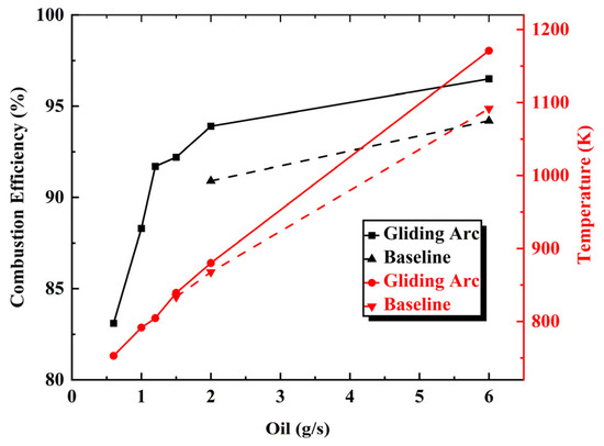 Analysis shows that the gliding arc significantly enhances combustion efficiency under low fuel flow rates, while, under high fuel flow rates, it improves combustion organization to enable the fuel to release more heat.