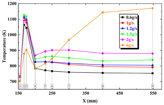 Figure 15 shows the axial cross-section temperature under different fuel flow rates in a gliding arc system. Clearly, the variation in fuel flow rate significantly impacts the combustion chamber temperature.