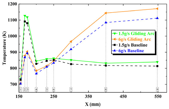 Figure 16 presents a comparative analysis of axial cross-section temperature under gliding arc versus baseline at different fuel flow rates. The results reveal that, while both methods produce similar temperature variation trends across sections, the baseline consistently yields lower temperatures than the gliding arc at all measured cross-sections. This observation aligns quantitatively with the combustion efficiency curves presented earlier, where the afterburner demonstrated lower combustion efficiency under baseline compared to gliding arc.