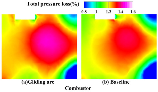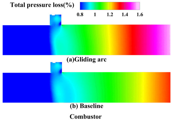 Under successful ignition conditions, the baseline achieves a total pressure recovery coefficient exceeding 0.977 at the combustor exit. However, at equivalent oil–gas ratios, the gliding arc system shows approximately 8% lower pressure recovery compared to the baseline.