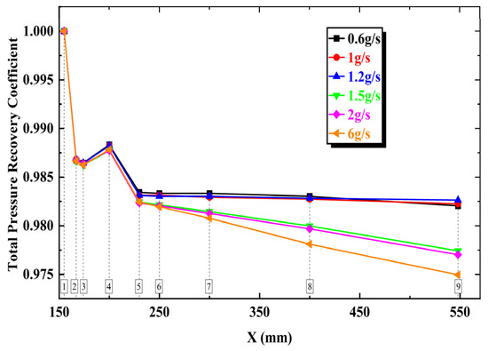 Figure 19 shows the distribution of total pressure recovery coefficient under gliding arc at different fuel flow rates. The results indicate that the variation trend of total pressure loss along the flow path is generally similar under different fuel flow conditions. From Section 1 to Section 3, the total pressure drops sharply. On one hand, this is due to the recirculation zone formed by the cavity where low flow velocity causes pressure loss and fuel injection also brings certain mixing loss. On the other hand, combustion initiates in the afterburner in this region and the violent gas expansion leads to total pressure loss. The total pressure partially recovers at Section 4. According to the previously analyzed temperature at different sections, the temperature at Section 4 decreases compared to Sections 2 and 3, resulting in reduced combustion intensity. The temperature contours also show that the combustion zone volume decreases, thus reducing thermal blockage caused by combustion. Meanwhile, the flow leaves the recirculation zone behind the cavity and gradually exits the low-speed zone, leading to decreased total pressure loss at Section 4. From Sections 5 to 9, the total pressure continues to decrease, but the combustion intensity begins to weaken after Section 6 and the combustion zone shrinks, resulting in relatively smaller total pressure loss. The rate of total pressure decrease rises with increasing fuel flow rate, especially under high fuel flow rates (6 g/s). At low fuel flow rates (0.6–1.2 g/s), the pressure loss at Sections 2 and 3 accounts for about 70% of the total pressure loss. At medium fuel flow rates (1.5–2 g/s), this proportion decreases to 60%, while, at high fuel flow rates (6 g/s), it further drops to about 55%. This agrees with previous conclusions that the combustion zone gradually moves toward the rear of the combustion chamber as fuel flow increases, causing the proportion of total pressure loss in the rear sections to progressively increase.
