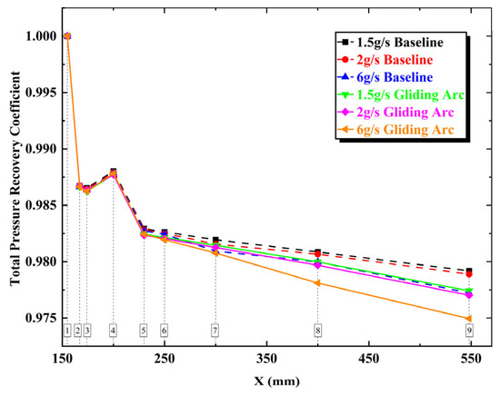 Figure 20 presents a comparison of total pressure recovery coefficient distributions between gliding arc and baseline under identical operating conditions. The results demonstrate that both methods exhibit similar trends in total pressure loss along the combustion chamber.