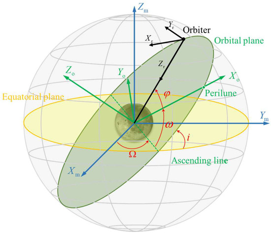 To establish the coordinate transformation from the coordinate system to , a three-step rotation sequence is implemented: (1) the orbital plane is rotated around the Z-axis of , aligning the ascending line with the X-axis of ; (2) the orbital plane is rotated around the X-axis, aligning the orbital plane’s normal vector with the Z-axis; and (3) the orbital plane is rotated around the Z-axis, aligning the direction of perilune with the positive X-axis. The coordinate transformation matrix is expressed as: