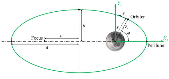 The position of the orbiter within its orbital cycle is characterized by . Utilizing Kepler’s third law and the parametric equations of an elliptical orbit, the distance from the orbiter to the lunar center can be expressed as: