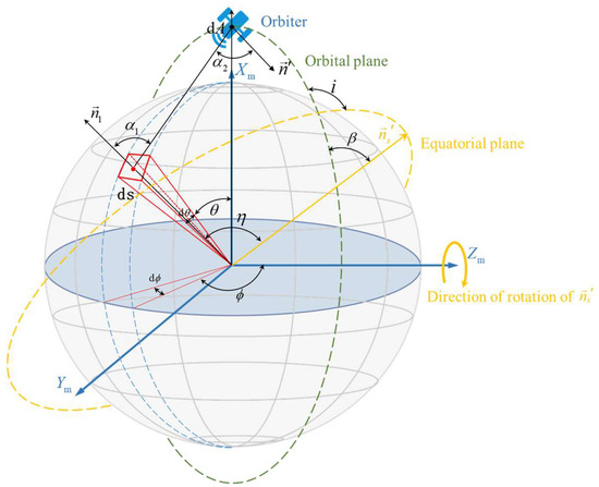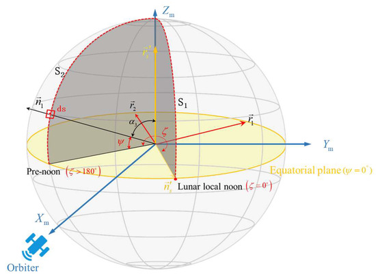 To facilitate the definition of integration bounds, a coordinate transformation is implemented in by rotating both the lunar sphere and the orbital plane until the line connecting the lunar center and the orbiter aligns with the positive X-axis. The resulting positional relationships among the transformed orbiter surface, orbital plane, solar vector, and lunar surface differential elements ds are schematically depicted in Figure 3. The transformation matrix is defined as: