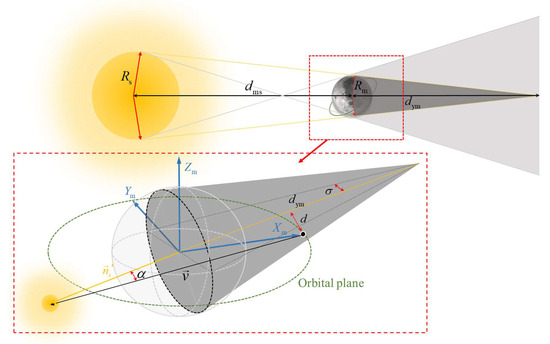 The calculation of solar radiation heat flux over an orbital period begins with determining the true anomalies and at which the orbiter enters and exits the lunar shadow. Geometrically, the lunar shadow is modeled as a conical region with its base formed by the Moon’s cross-section normal to the solar vector, as illustrated in Figure 4. The geometric equations are: