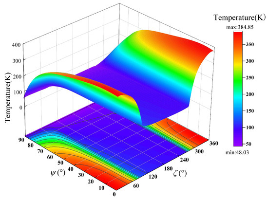 Table 2 summarizes the coefficients of the polynomial terms, mean squared error (MSE), and coefficient of determination (R2) for the non-uniform lunar surface temperature fitting. Figure 6 displays the lunar surface temperature contour and its two-dimensional projection generated from the polynomial fitting results.