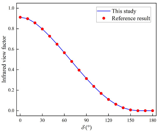 To validate the effectiveness of the computational methodology and procedures used in this study, the infrared view factor of Earth under typical operational conditions was calculated. The results were compared with theoretical analytical solutions from the Radiative Exchange Factor Handbook [9], as shown in Figure 8. The selected case features a 300 km orbital altitude and the angle between the outer normal vector of the orbiter surface and the line connecting the orbiter to the Earth’s center . Comparative analysis demonstrates that the proposed method for determining the infrared view factor between planetary surface elements and the orbiter achieves reliable accuracy, confirming the validity of our computational approach.