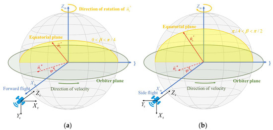 The flight attitudes of the orbiter encompass two operational modes with four distinct orientations, determined by . The sign convention of assigns a positive value when the solar vector aligns with the orbital normal vector and a negative value when opposing it. The forward flight mode is adopted when resides within the range , while the side flight mode is adopted if . Table 1 shows the flight attitude and orientation of the surfaces of the orbiter.