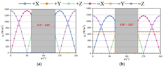 Figure 9 shows the two different flight attitudes and the outer normal direction of each surface under the and condition. The other two attitudes in Table 1 correspond to and , which is the undrawn part of the equatorial plane in Figure 9. As indicated in Table 1, while the +Z-axis remains unchanged under these attitudes, the +X-axis and +Y-axis are reversed compared to their directions shown in Figure 9. Figure 10 shows the solar radiation heat flux from different directions of a hexahedral orbiter under the condition. Consequently, and exhibit symmetry relative to . The range of , within which the orbiter resides in the lunar shadow region , varies gradually for . When , exceeds , leading to extended periods of no solar radiation exposure for the orbiter. For the two flight modes, the heat flux from the opposite direction of heat-dissipating surfaces (+Y surface for forward flight mode and +X surface for side flight mode) remains stable throughout the orbital period. The heat flux from +Z direction is most heavily affected by the lunar shadow region, while from −Z direction is unaffected by the region. Additionally, from the other two directions exhibit symmetric variations relative to the region with respect to , sharing both the rate of change and peak values with the from –Z direction.
