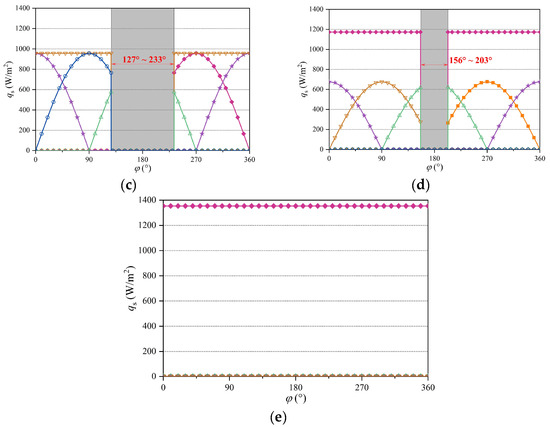 In each direction of a hexahedral spacecraft under the condition (a) . (b) . (c) . (d) . (e) . The gray areas and the red numbers represent the range of where the orbiter is in the lunar shadow region, and the value of and .