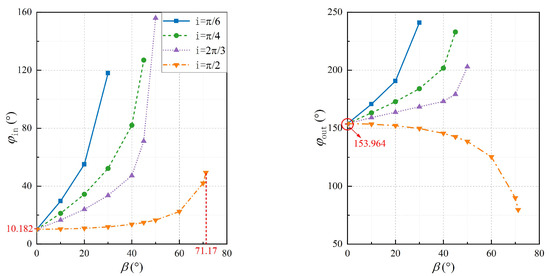 Figure 11 presents and under different and . For the elliptical orbit, when , even with identical , and differ across varying . Furthermore, when , the symmetry of and relative to is no longer preserved. Comparative analysis reveals that exhibits a monotonic increase with under constant . Notably, for , remains invariant with , resulting in slower variations in and an opposite trend in compared to other cases. When and , the orbiter does not enter the lunar shadow region during the entire orbital period.