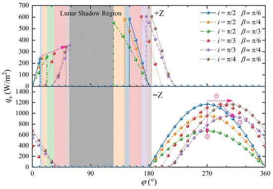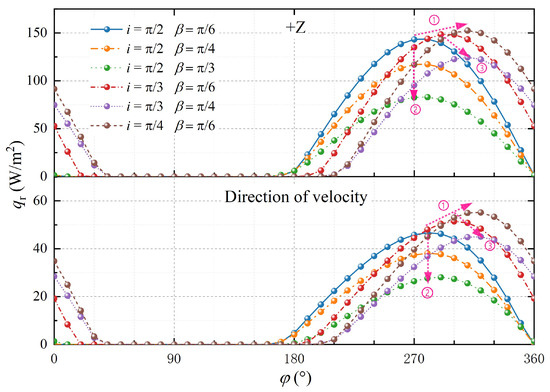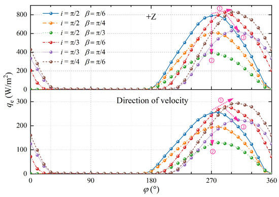 Figure 16 illustrates the heat flux in the +Z and the velocity direction of the orbiter for . Overall, the influence of varying and on and is similar. From the mathematical perspective, this similarity arises because is proportional to the fourth power of , with the high temperature regions near the subsolar point dominating the contribution. As the orbiter approaches the lunar noon region, the value of and become increasingly similar, while approximately equal to zero. This convergence results in analogous variation trends between heat fluxes and . Physically, ds, which are under stronger solar illumination, absorb and reflect greater thermal flux, resulting in higher local temperatures and enhanced radiative emission. Consequently, the observed similarity in and evolution is consistent with theoretical expectations.