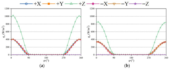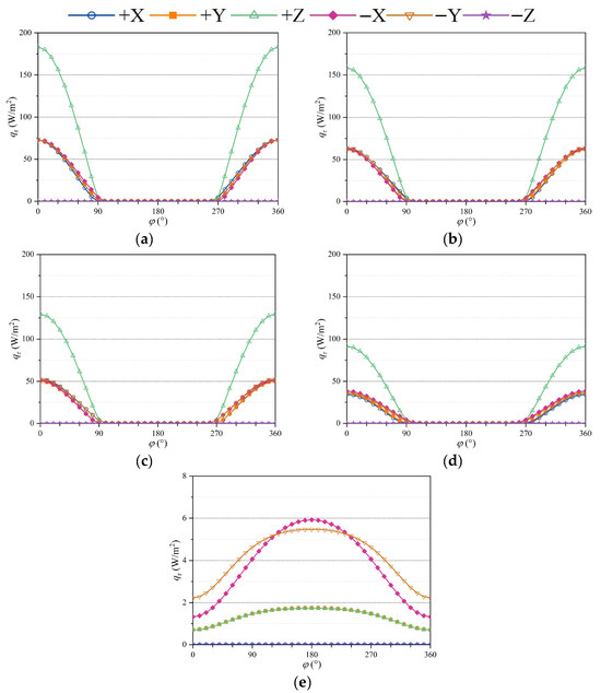 Figure 13 presents the lunar albedo thermal flux from six different directions under the condition. The thermal flux also demonstrates symmetrical characteristics relative to , with maximum observed along the +Z direction and along the −Z direction consistently, and exhibits comparable magnitudes on the remaining four directions. Moreover, exhibits significant variation with changes in : the peak reaches 183 W/m2 when , while only on the order of 101 W/m2 when .