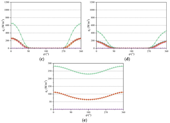 To systematically analyze the influence of variation on the under distinct , numerical results for both +Z and −Z directional fluxes at are obtained, as illustrated in Figure 12. The analysis of variations in the −Z direction reveals consistent behavior with the scenario, demonstrating that the presence of lunar shadow regions does not significantly influence along this direction. For different , from −Z direction, velocity vector direction, and anti-velocity direction maintain identical variation trends and peak values under equal conditions when excluding lunar shadow effects, while primarily affecting the range of corresponding to . Notably, elliptical orbital characteristics introduce asymmetric thermal flux distributions in other ≠0 directions. The heat flux in the +Z direction particularly highlights this orbital eccentricity effect, showing significant deviation from the symmetrical heat flux patterns observed in or circular orbit scenarios.