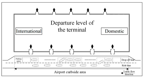 Most researchers focus on how to properly plan and design curbsides to address ground congestion around airports and flight delays. Increasing curbside capacity is a popular method. Parizi et al. conducted a comprehensive investigation into airport terminal curbside design by analyzing passenger demand patterns, and their research led to the development of a novel single-lane parking simulation model for evaluating curbside operational capacity [5]. Then, Lu et al. proposed a two-lane curbside capacity formula considering internal and external mobility based on a single road parking model, and the results showed that the curbside capacity could be effectively improved by adding other lanes [6]. Zhang found that curbside capacity can be improved by optimizing the form of berth arrangement [7]. However, all these articles estimated the curbside length by empirical values or formulas, which led to changes in results that were difficult to explain. After that, the research focus turned to simulation modeling, aiming to explain the impact of traffic flow on curb capacity from a microscopic perspective. Various researchers conducted theoretical analysis through queuing models and established a curbside capacity calculation model with vehicle arrival, stopping, and departure times as indicators [8,9,10,11,12]. Chen et al. analyzed the impact of lane width, number of vehicles, stopping mode, and other factors on the curbside capacity; based on the queuing theory and the influence coacceptable method, they established a capacity calculation model considering the time of passenger alighting and vehicle stopping time [10]. Liu et al. considered the role of vehicles and added the constraints of the car-following (CF) model to establish a two-lane parking model, which solved the problem of calculating the number and length of parking spaces, the study also showed that even if all the parking needs were satisfied, a certain amount of delay would be incurred [11]. Harris et al. developed a mesoscopic simulation model to evaluate the effectiveness of management policies for addressing increasing airport curbside congestion. The model simulates scenarios of parking allocation, increased passenger demand, and dwell time constraints. The results show that different management strategies with different impacts on various scenarios can significantly reduce the waiting time for passengers and vehicles [12]. In summary, existing studies largely rely on empirical formulas, leading to insufficient accuracy; some static or simplified assumptions overlook real traffic fluctuations and passenger behavior differences, and there is also a lack of systematic evaluation across multiple scenarios and strategies. However, the previous work has laid a better foun-dation for the study of the terminal curbside.