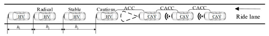 CACC vehicles can utilize inter-vehicle communication technology to implement communication with the front vehicle, but the realization of CACC vehicle functions requires the front vehicle to install communication equipment. In other words, if the lead vehicle of CAV is CAV, the vehicle is controlled by CACC; on the contrary, if it is HDV, CACC degrades to ACC, so the interaction of information is realized by the ACC and the CACC vehicle constituting the connected vehicle fleet. Due to the limited length of the curbside, it is assumed that inter-vehicle communication can be realized within the length of the curbside, and the vehicle distribution is shown in Figure 2.