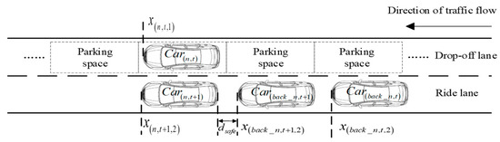 where denotes the position of Carn in the drop-off lane at time t, denotes the position of the vehicle closest to the back of Carn in the direction of traffic flow in the ride lane at time t, denotes the speed of the vehicle closest to the back of Carn in the direction of traffic flow in the ride lane at time t, and denotes the maximum acceleration of the vehicle during deceleration braking.