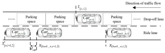 where denotes the position of the nearest vehicle in front of Carn in the direction of traffic flow in the ride lane at time t. Equation (4) is to ensure that Carn enters the ride lane and the vehicle in front has enough distance. Equation (7) indicates that Carn enters the ride lane, and the vehicle behind will not collide at the next moment.