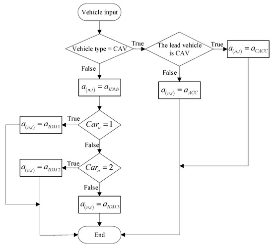 The simulation environment accounts for car-following model effects on all vehicles except the first vehicle at the curbside. In addition, the simulation experiment has five different types of vehicles, and they are controlled by different car-following models, respectively. Therefore, this section provides an explanation for the selection of car-following models in the vehicle simulation process: this paper constructs the model in MATLAB to realize, three different HDVs in the simulation experiment are in the form of numbers, and the CAVs can select the appropriate model through the type of the lead vehicle. The specific choice of the car-following models is shown in Figure 6. Carn denotes the n-th vehicle. indicates the acceleration of Carn at the moment of t. Carn = I means that the Carn belongs to vehicle type I (I = 1 denotes type radical, I = 2 type stable, and I = 3 type cautious).