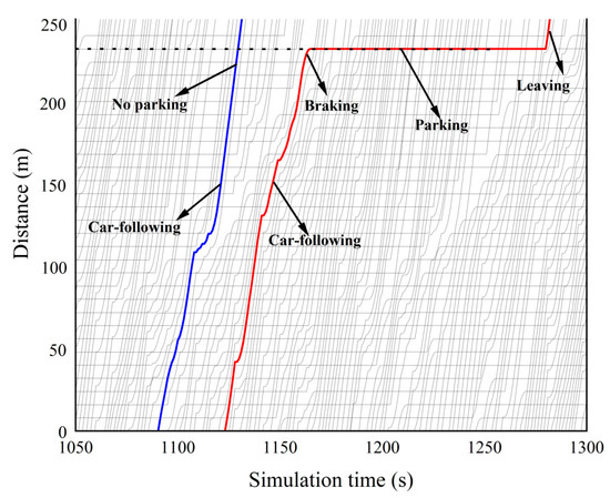 The temporal and spatial distribution of vehicle trajectories, where the red lines represent trajectories with parking, and the blue lines represent trajectories without parking.