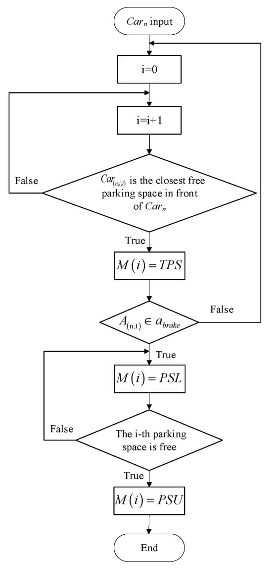 To be able to clearly explain the principle of simulation. We set up three kinds of parking space statuses: target parking space (TPS), parking space locking (PSL), and parking space unlocking (PSU). The status of the parking space is summarized in Table 4. denotes the status of the i-th parking space. When a parking space is in the PSU status, it means that a vehicle completes the parking service and satisfies the condition of leaving the drop-off lane. If the i-th parking space is the nearest free parking space in front of the Carn, then the status of this parking space is TPS. Notice that the Carn at this moment can be many vehicles. When the status of a parking space changes from TPS to PSL status, it means that one of the many vehicles is about to park in the parking space. The PSL status is realized in relation to the of the vehicle. When the vehicle departs from the parking space, the status of the parking space is the PSU status. The detailed process is shown in Figure 8. The parking spaces are ranked according to the direction of traffic flow, with the first space denoted by 1 and continuing. denotes the i-th parking space of Carn at time t.