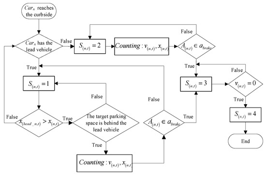 In the simulation experiment, the speed and position of the vehicles are updated as shown in Equation (10). The acceleration follows the following principle: when Carn is in the AFR status, the vehicle drives with the maximum acceleration. When Carn is in ACF status, follows the principle shown in Figure 3. The acceleration of the vehicle in status AB is calculated by Equation (11). When the i-th parking space is the nearest free parking space in front of Carn, it is calculated whether is within the range of . If it is within its range, the calculation results in the acceleration of the Carn in the AB status. If it is not, the Carn continues to follow the vehicle. The change in vehicle status is shown in detail in Figure 7.