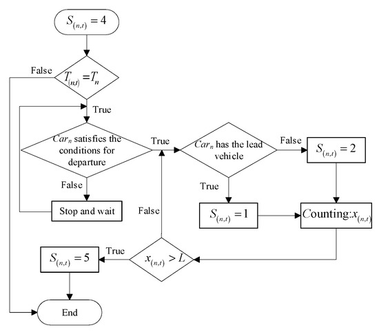 The principle of vehicle departure is shown in Figure 10. The AP status of the vehicle is used as the starting point in the figure. When Carn completes the parking service and satisfies the departure conditions (6) or (4), (7), and (9). The vehicle can enter the ride lane, and then Carn leaves the curbside in ACF or AFR status. is the Carn’s stopping time, denotes the time that Carn has been parked at the moment of t, L denotes the length of the curbside.