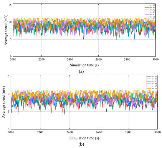 To intuitively demonstrate the impact of different penetration rates on overall vehicle speed under the same parking demand, we use a curbside length of 400 m as an example. The simulation stabilization period is chosen to last between 2000 s and 3000 s, as shown in Figure 11. In the figure, the vertical axis represents the average speed of all vehicles per second within the curbside length.