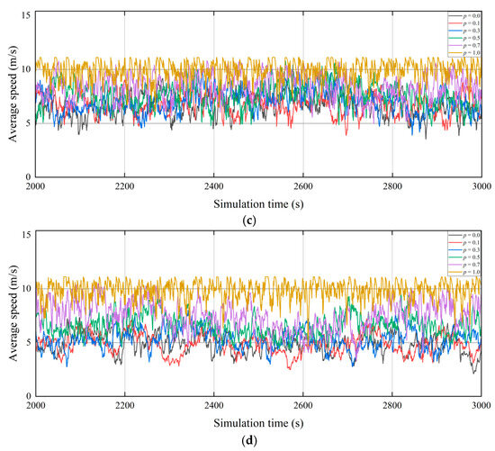 Results of the analysis of the average speed of vehicles. (a) 900 pcph, (b) 1100 pcph, (c) 1300 pcph, (d) 1500 pcph.
