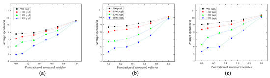 Figure 12 shows the existence of two phenomena for three curbside lengths. Under the same parking demand, as the penetration rate p increases, the average speed value shows an increasing trend. Moreover, the greater the parking demand, the greater the increase in the average speed value, which means that the overall traffic efficiency of the vehicle is improved more effectively. In Figure 12b, we compare the average speed at p = 1 with that at p = 0 for different parking demands. When the parking demands are 900 pcph, 1100 pcph, 1300 pcph, and 1500 pcph, the overall traffic efficiency of the vehicle is improved by 16.83%, 25.51%,48.69%, and 83.59%, respectively. Since the average velocity values all float around 10 m/s at p = 1, the magnitude of traffic efficiency improvement depends on the traffic situation at p = 0. At the same penetration rate p, with the increase in parking demand, the average speed value shows a decreasing trend. Moreover, with the increase of penetration rate p, the average speed value tends to be close to the state for different parking demands. To exemplify this phenomenon, we calculated the maximum difference in average speed for different parking demands. The results are summarized in Table 5. The addition of the CAVs optimizes the operational efficiency of the traffic flow. As the penetration rate p increases, when the penetration rate p is 1, as the homogeneous traffic flow of CAVs, there is no major difference in the overall average speed of the traffic flow under different parking demands. This is of great help in solving the congestion situation in the terminal building, where the curbside presents different congestion for different traffic volumes.