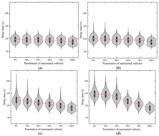 Results of the analysis of vehicle delay times. (a) 900 pcph, (b) 1100 pcph, (c) 1300 pcph, (d) 1500 pcph.