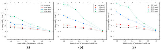 In terms of the effect of CAVs being able to reduce the vehicle delay time, this effect depends on the traffic condition at p = 0. In Figure 14b, when the parking demands are 900 pcph, 1100 pcph, 1300 pcph, and 1500 pcph at p = 0, the average vehicle delays are 117.32 s, 121.70 s, 138.89 s, and 158.94 s, respectively. The results indicate that the greater the parking demand, the greater the reduction in delay time. This may be caused by the fact that when parking demand is high, the changes in vehicle status within the mixed traffic flow are more complex and tend to cause congestion.