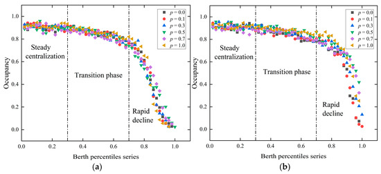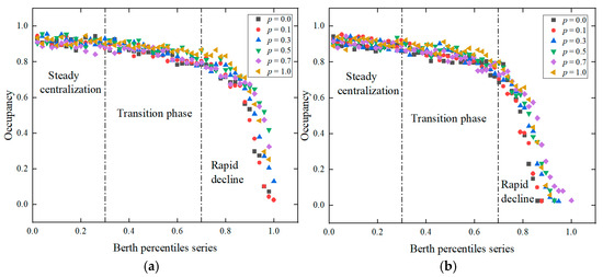 (3) The mixed traffic flow at different penetration rate p shows a consistent pattern in terms of parking space utilization: the occupancy rate decreases as the berth percentage increases. Specifically, it can be divided into three stages. The first stage (0–30% of berths) shows parking space utilization concentrated around 90%, exhibiting a stable and concentrated pattern. The second stage (30–70% of berths) sees parking space utilization fluctuating between 80% and 90%, showing a slow declining trend but still maintaining a high level. The third stage (70–100% of berths) experiences parking space utilization dropping below 80%, with a rapid decline at a stable rate and consistent slope.