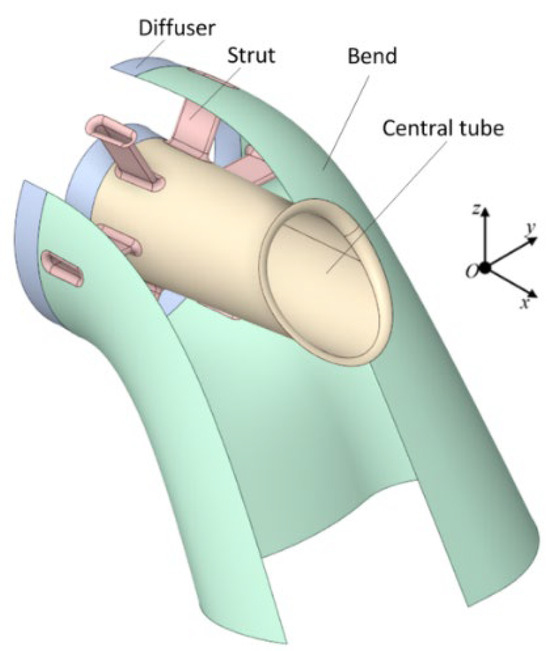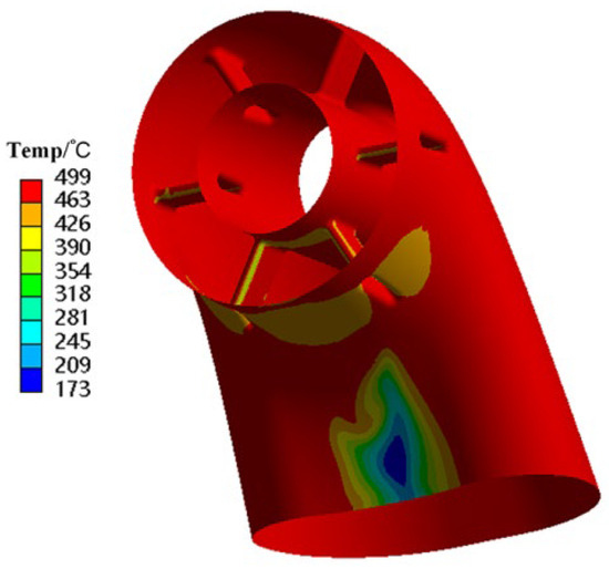 According to the installation conditions of the exhaust duct during actual operation, the front mounting edge of the diffuser is set as a fixed constraint boundary condition. By utilizing the coupling relationship between fluid software and structural finite element software, the temperature field obtained from the fluid-thermal coupling calculations is interpolated and mapped onto the structural mesh of the exhaust duct. This process enables a thermodynamic analysis that yields the wall temperature distribution of the mapped structural mesh, as illustrated in Figure 3. The areas of uneven temperature distribution in the exhaust duct are mainly at the front edge of the struts and the inner side of the bend, particularly at the outlet end of the bend, where a large area of low-temperature region exists.