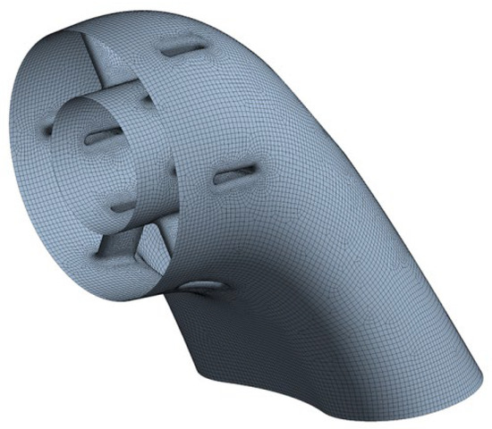 Figure 1 illustrates the non-axisymmetric exhaust duct, which consists of an annular diffuser, a bend, a central tube, and struts. Six struts are uniformly distributed around the inlet of the exhaust duct, connecting the central tube to the bend through a large, rounded corner transition. Additionally, the central tube and the bend are connected by a large, rounded corner transition. The geometric design method for the non-axisymmetric exhaust duct is detailed in reference [19]. The dimensions of the benchmark exhaust duct model are substantial, measuring approximately 1200 mm × 1000 mm × 1300 mm (length × width × height). The overall structure of the exhaust duct is formed through combination welding between the annular diffuser, bend, central tube, and struts. All components are constructed from GH3536 material, with a sheet thickness of 1 mm, and the material parameters are derived from the aerospace materials handbook [20], as shown in Table 1. The finite element calculation model is divided into a hexahedral mesh format with local refinement, totaling 46,105 elements, as shown in Figure 2.