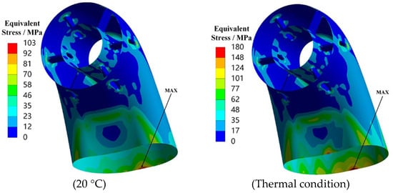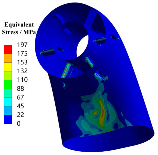 Based on the temperature field distribution of the exhaust duct, the thermal stress distribution is obtained through thermal-structural coupling analysis, as shown in Figure 4. The overall stress level of the exhaust duct is relatively low, with noticeable stress concentrations occurring only at the front edge of the struts and the inner side of the bend. The thermal stress at the front edge of the struts is approximately 182 MPa, while the thermal stress on the inner side of the bend is about 197 MPa, both of which are well below the material’s yield strength and will not lead to fatigue failure. Therefore, this also indicates from another perspective that the vibration stress of the exhaust duct in a thermal environment is the primary cause of its potential fatigue failure.