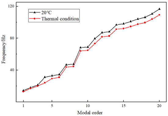 The variation in the first 20 natural frequencies of the exhaust duct under thermal and ambient temperature conditions is shown in Figure 5. As illustrated, the natural frequencies of all modes decrease when the structure is subjected to heating, with the differences becoming increasingly pronounced at higher modes. This phenomenon can be attributed to the structural heating, which leads to thermal stress and changes in the material properties, particularly the elastic modulus, resulting in a reduction in stiffness and thus causing the natural frequencies of the exhaust duct to decrease.