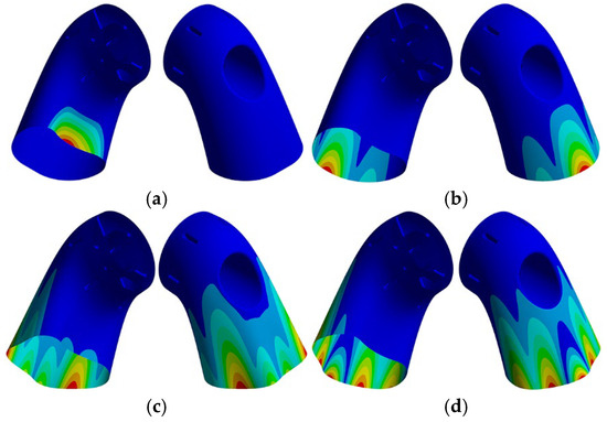 A comparison of the finite element analysis results reveals that the mode shapes of each order remain largely consistent before and after heating. As discussed in Section 2, the high-temperature environment primarily affects the overall stiffness of the structure, but the stiffness distribution remains largely unchanged. Additionally, the structure’s geometry and boundary conditions remain unaffected. Therefore, the mode shapes are essentially the same before and after heating. Due to space limitations, only the modal shapes of the exhaust duct under thermal conditions are presented in this paper. Figure 6 shows several typical modal shapes of the exhaust duct under thermal conditions. The modal shapes of the exhaust duct can be mainly categorized into local modes and global modes. Local modes are primarily distributed at the outlet end of the bend and the front end of the central tube, where the low-order vibration modes in the initial few orders develop from a single circumferential waveform at the outlet of the bend into multiple waveform shapes. In contrast, global modes exhibit coupling and interaction among the bend, central tube, and struts, with the 12th order mode being the first mode of the overall modal shape of the exhaust duct. The primary modal characteristics of the exhaust duct, as presented above, suggest that the stiffness of the diffuser section is relatively high due to the fixed boundary conditions at the inlet, making it less susceptible to excitation. In contrast, the central tube and the latter half of the bend exhibit more intricate modal characteristics due to their cantilevered structure.