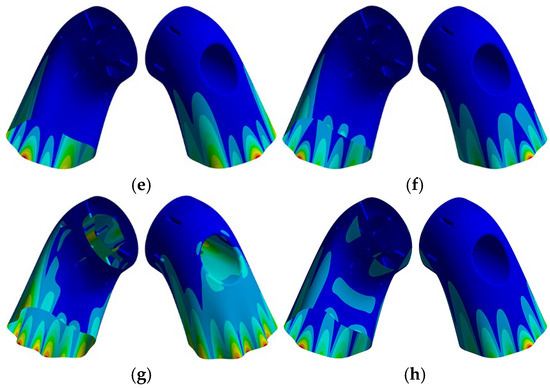 Typical modal shapes of specific orders. (a) 1st order; (b) 2nd order; (c) 5th order; (d) 6th order; (e) 7th order; (f) 9th order; (g) 12th order; and (h) 13th order.