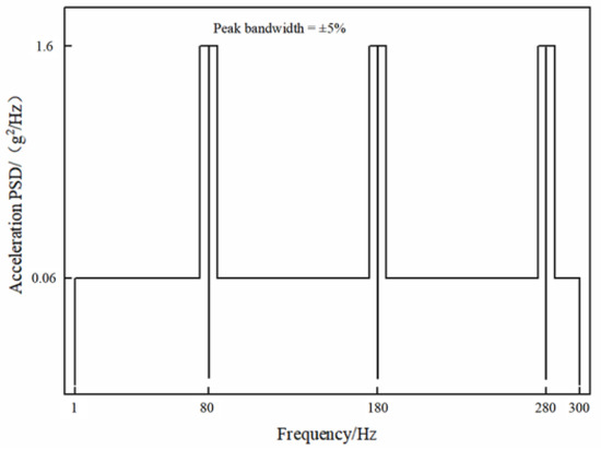 The random vibration load is presented in the form of an acceleration load spectrum consisting of a broadband background plus narrowband peaks, as shown in Figure 7. Based on practical engineering considerations, the frequency range and magnitude of the random vibration power spectral load are determined. The frequency range of the broadband background is 0–300 Hz, with a magnitude of 0.06 g2/Hz; the narrowband peak frequencies are 1 to 3 times the speed of the power turbine, specifically at 80 Hz, 180 Hz, and 280 Hz, with a magnitude of 1.6 g2/Hz.