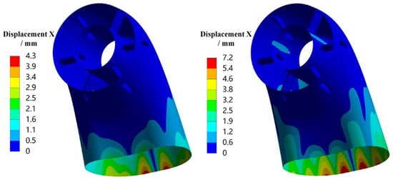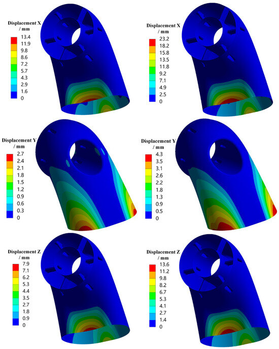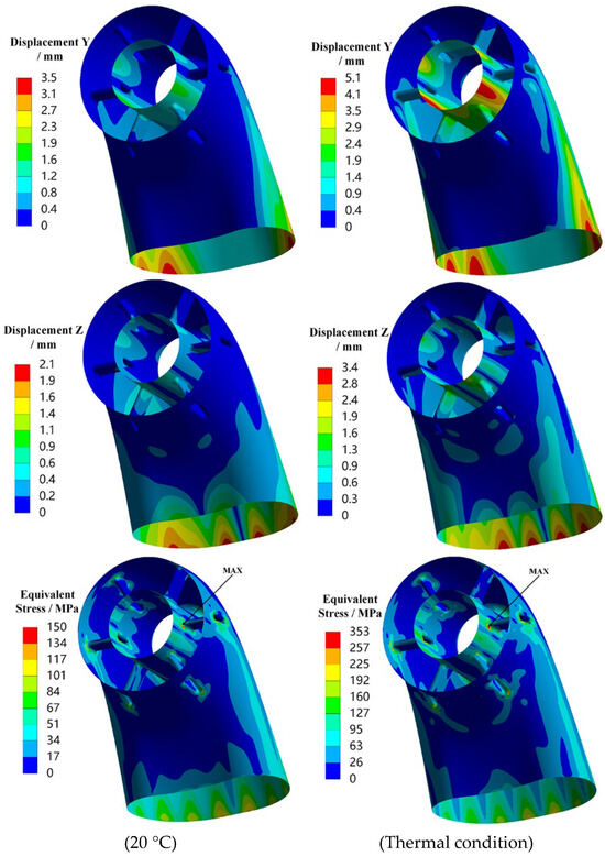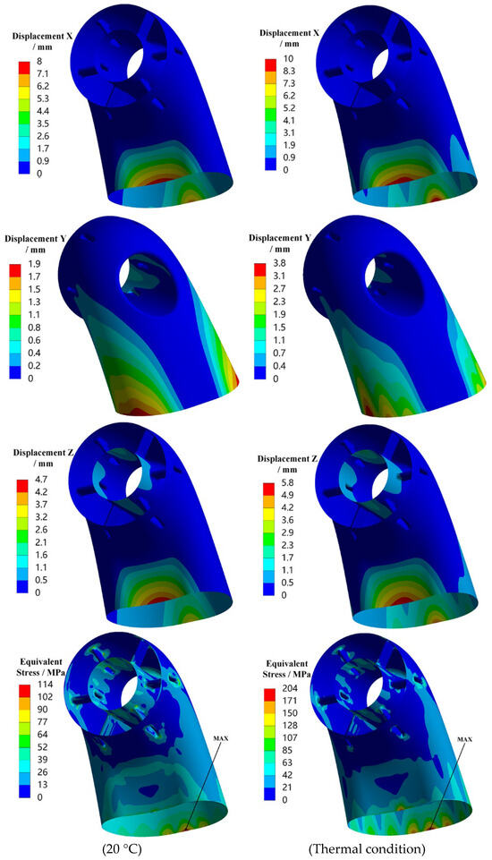 The 1σ deformation in the X, Y, and Z directions and equivalent stress distribution of the exhaust duct under X-axis random vibration loading are presented in Figure 8. It can be observed that, under X-axis loading, both the displacements and equivalent stresses in all directions increase under thermal conditions, especially with significant increases in X-direction deformation and overall equivalent stress. The maximum deformation in the X and Z directions is concentrated on the outer and inner sides of the exit end of the bend, while the maximum deformation in the Y-direction is concentrated on both sides of the exit end of the bend. Regions with higher equivalent stress include the rounded corners where the struts transition to the central tube, as well as the exit end of the bend, with the maximum stress occurring on the outer side of the lower bend’s exit end. Therefore, it is evident that under X-axis loading, the maximum equivalent stress and displacements in all directions occur at the exit end of the bend. This can be attributed to the low stiffness of the exit section, which results from the long cantilever structure of the exhaust duct and corresponds with the modal shapes of the exhaust duct.