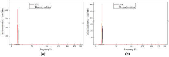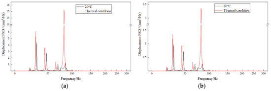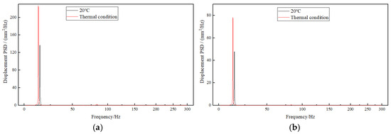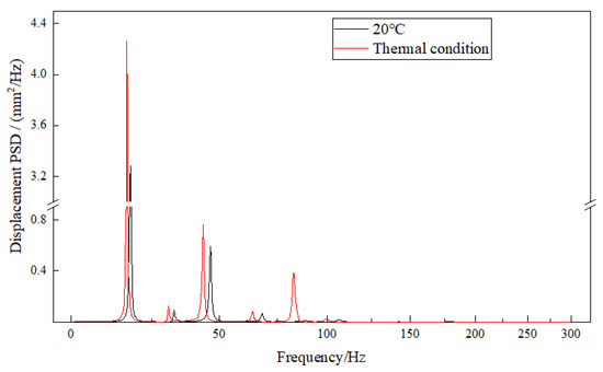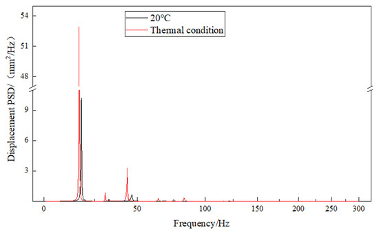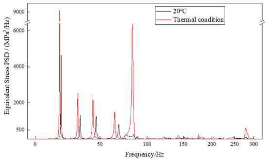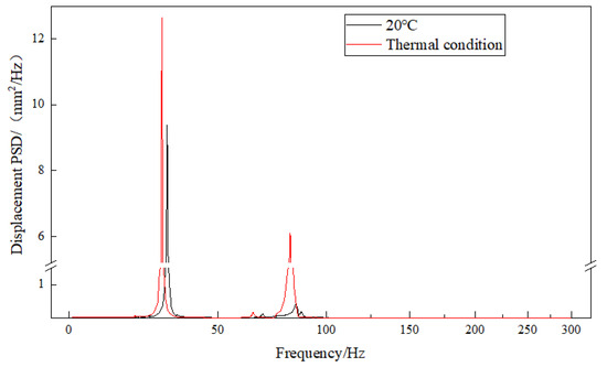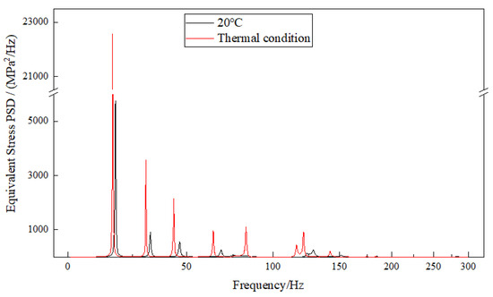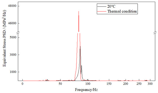 Based on the displacement deformation contours of the exhaust duct, the positions of maximum deformation in the X and Z directions are identical. Node 3206 at the inner side of the exit end of the bend is selected for X-direction and Z-direction displacement response analysis, as shown in Figure 9; Node 3414 on the right side of the exit end of the bend is selected for Y-direction displacement response analysis, as shown in Figure 10; and Node 3379 at the inner side of the exit end of the bend is selected for equivalent stress response analysis, as shown in Figure 11. It can be observed that the PSD response curves exhibit peaks at multiple frequencies, indicating that the random vibration load has excited several modes of the exhaust duct, with lower-order modes being more easily excited. Furthermore, influenced by the temperature field, the response peaks of the exhaust duct have shifted to lower frequencies, which is attributed to the decrease in thermal modal frequencies of the exhaust duct at the same orders. Moreover, the response amplitudes of both displacement and equivalent stress of the exhaust duct under thermal conditions have significantly increased, which aligns with the distribution observed in the displacement and equivalent stress contours presented in Figure 8.