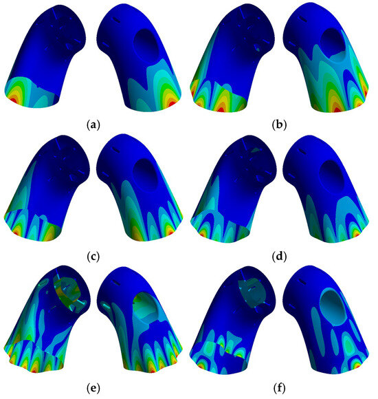 Typical modal shapes of specific orders. (a) 2nd order; (b) 6th order; (c) 7th order; (d) 9th order; (e) 12th order; and (f) 13th order.